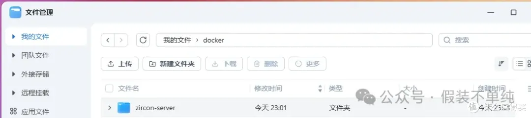 创建数据保存目录:安装之前需先在docker文件夹中新建一个“zircon-server”文件夹,用于配置持久化保存,后面所有相关文件都存在这里。