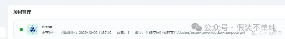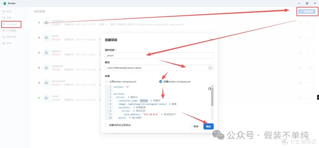 配置compose代码:在docker界面,点击左侧[compose],右侧[新增项目],[项目名称]填zircon,可识别即可,路径选择上面新建的文件夹,选择创建docker-compose,将下面代码复制粘贴到代码框,关键修改IP地址为上面创建的固定IP段里面的任一IP,我这里就定为172.30.0.6,为了方便大家理解,我把每个代码都加了注释。(害怕格式错误也可以让ai修改)。